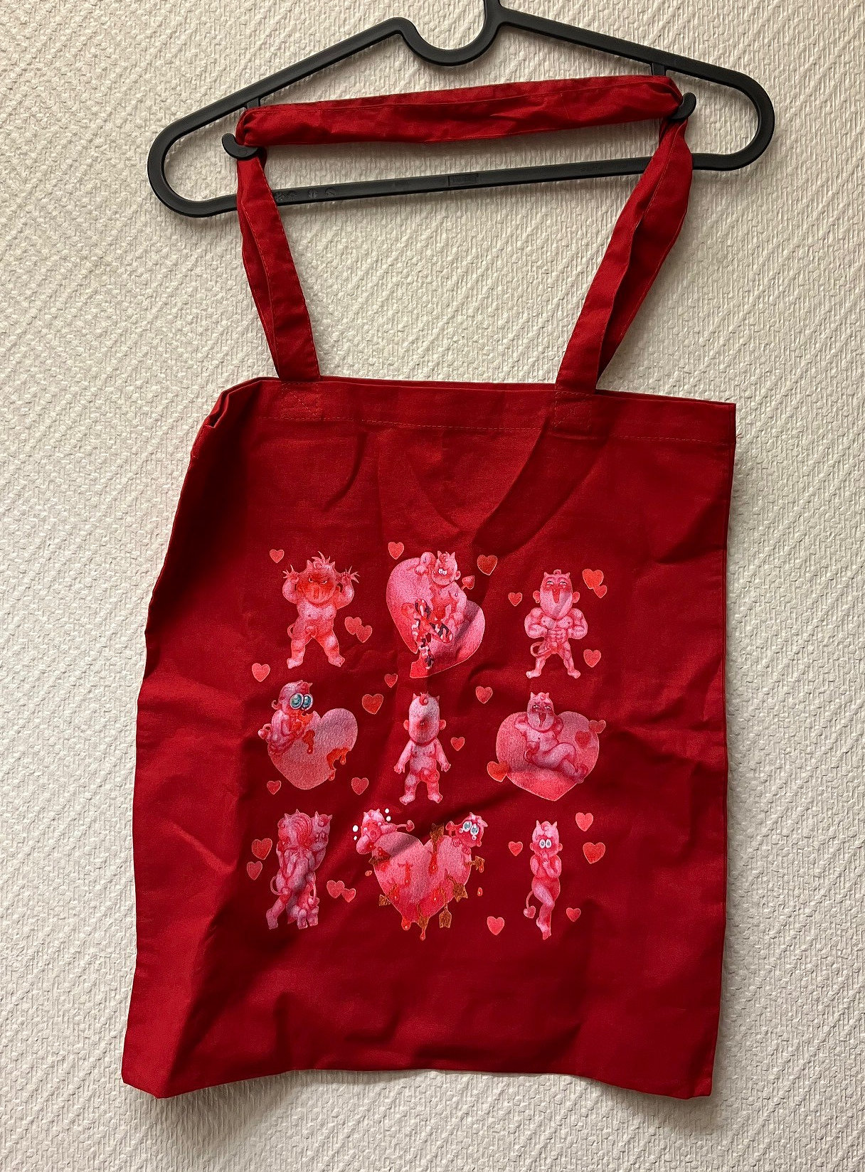 Nicely sized red tote bag with many different daily emotions. Not the best print quality